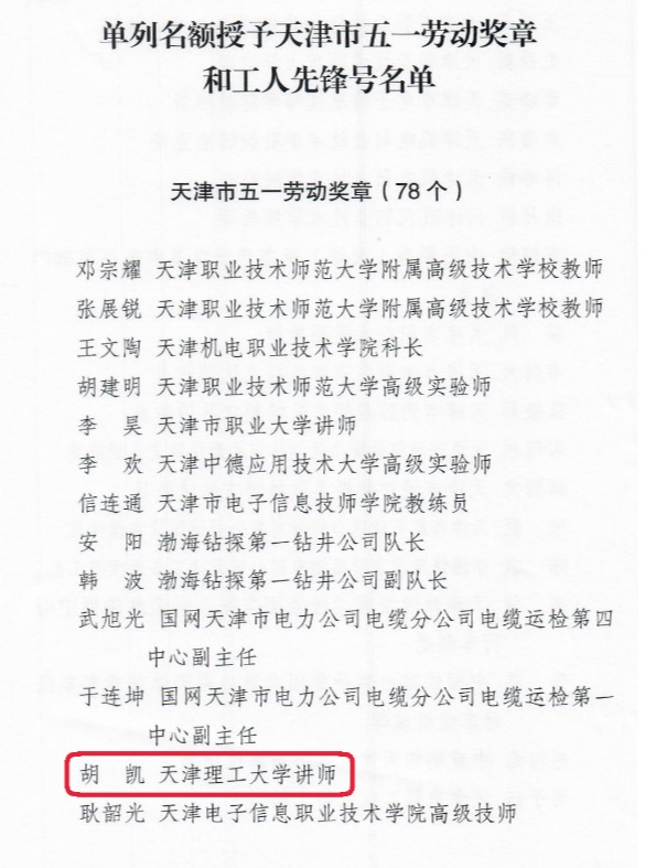 近日,市总工会发布《关于单列名额授予天津市五一劳动奖章和工人先锋号的决定》。新葡萄集成电路科学与工程学院教师胡凯,凭借其在职业技能领域的突出成就,被授予天津市五一劳动奖章,成为此次受表彰的78名个人之一。