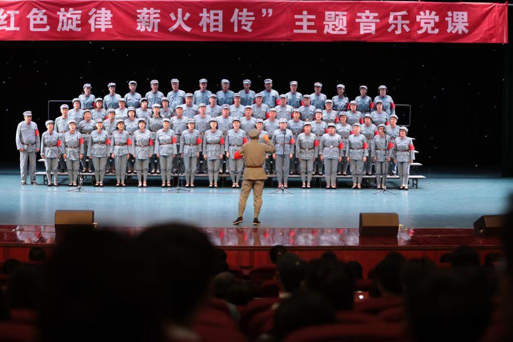 由70位退休教师组成的学校“山之歌”合唱团,穿插演唱了《延安颂》《保卫黄河》等7首脍炙人口的经典革命歌曲,将广大师生的思绪带入战火纷飞的革命年月,穿越历史的长河,唤起青年学子对革命理想的执着追求,将主题音乐党课推向高潮。