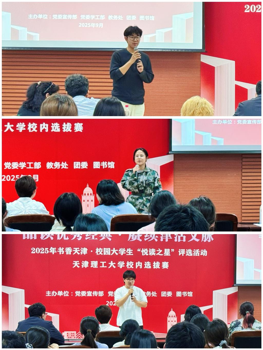 9月24日下午,“品读优秀经典·赓续津沽文脉”2025年书香天津·校园大学生“悦读之星”评选活动校内选拔赛在图书馆多功能厅举行。本次活动旨在引导广大学生深入阅读城市文化经典,传承天津深厚的历史文脉,营造积极向上、书香浓郁的校园文化氛围。