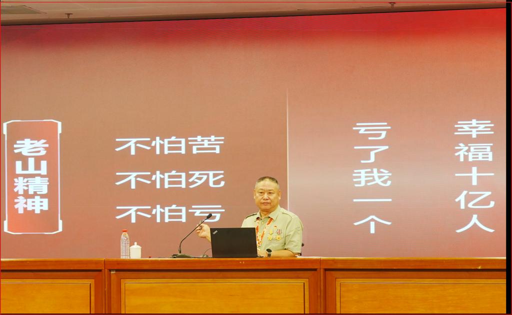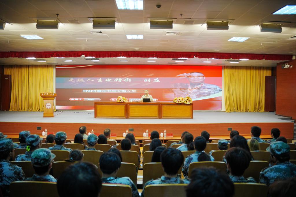 随后,一等战功荣立者、“钢铁战士”刘庄带来了震撼人心的事迹分享《无腿人生也精彩》。刘庄于1984年10月入伍,因作战英勇、意志顽强荣立一等战功,作为全军第二届英雄模范代表,曾受到党和国家领导人的亲切接见。“亏了我一个,幸福十亿人”,他用朴实而坚定的语言回顾了战场上浴血奋战的经历。“不怕苦、不怕死、不怕亏”的老山精神令在场师生深受触动,掌声经久不息。