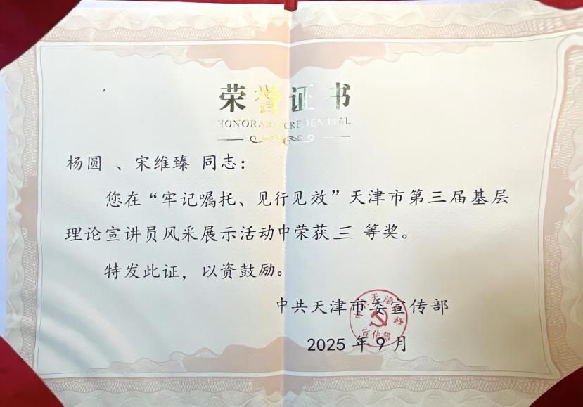 近日,学校语言文化学院2022级英语专业学生杨圆、宋维臻,在“牢记嘱托、见行见效”天津市第三届基层理论宣讲员风采展示活动中取得佳绩,其文艺类作品《津韵非遗 践行致远》凭借创新性的宣讲形式与深刻的理论内涵荣获三等奖。