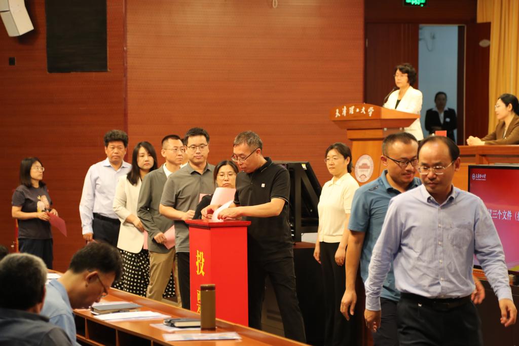 人事处主要负责同志对《新葡萄AMG官方网站岗位设置与聘用实施意见》《2025-2028年聘期全员岗位聘用实施方案》《新葡萄AMG官方网站绩效工资实施办法》三个审议稿拟定情况作说明。大会以无记名投票的方式对三个文件进行表决,最终均获高票通过。