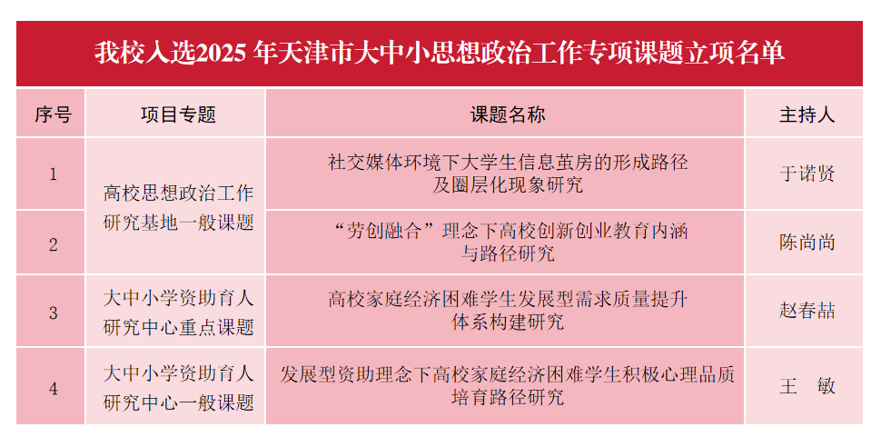 在2025年获批立项的187项天津市大中小思想政治工作专项课题中,新葡萄共获批课题4项,其中重点课题1项,一般课题3项。