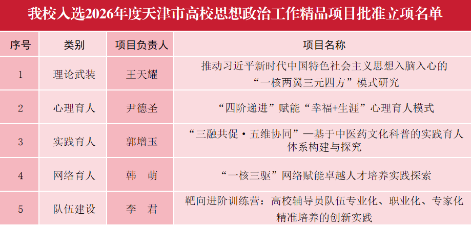 在2026年度天津市高校思想政治工作精品项目申报工作中,全市共收到立项申报226项,决定批准立项85项,新葡萄在理论武装、心理育人、实践育人、网络育人、队伍建设类别中共有5个项目脱颖而出进入批准立项名单。