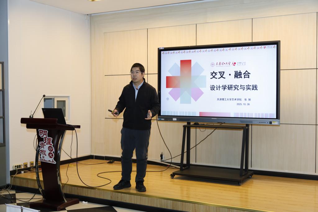 张旭聚焦“设计+文旅”“设计+地方产业”“设计+智能制造”“设计+科学研究”“设计+AI”五个融合方向,作题为“交叉融合——设计学研究与实践”的学术报告。他通过非遗传统手工艺产业化再设计、AI赋能文旅宣传、高端装备研发设计等具体案例,深入剖析了设计学跨学科应用的创新模式与实践路径。