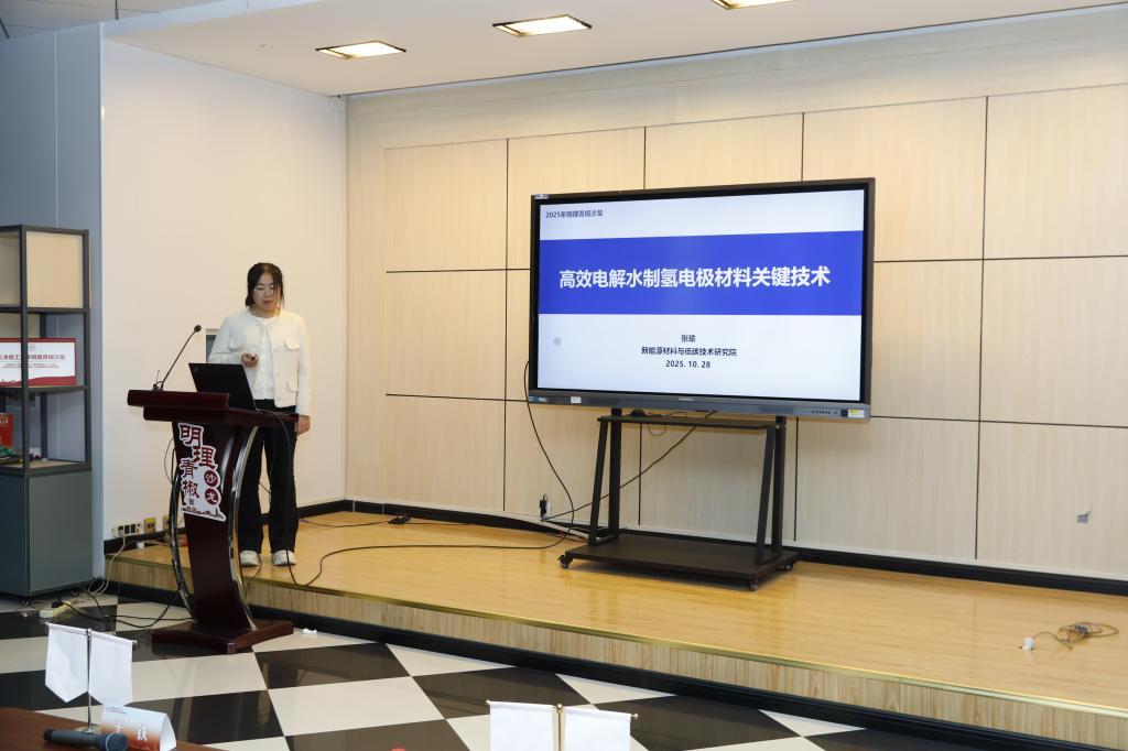 张瑜作题为“高效电解水制氢电极材料关键技术”的学术报告。她聚焦析氢/析氧反应特性,深入探讨催化剂的可控设计路径,系统揭示催化反应机理与材料动态演变过程,介绍了这一前沿研究成果在质子交换膜、阴离子交换膜水电解槽中的实际应用。该研究为高效制氢技术发展提供了新思路。