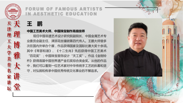 王鹏大师讲座主题为《黄金与艺术》,他结合亲身参与设计的三十余款珠宝的审美理念和创作经验,详细介绍首饰设计作品中所用到的各种材料和首饰设计作品中所蕴含的传统文化内涵。