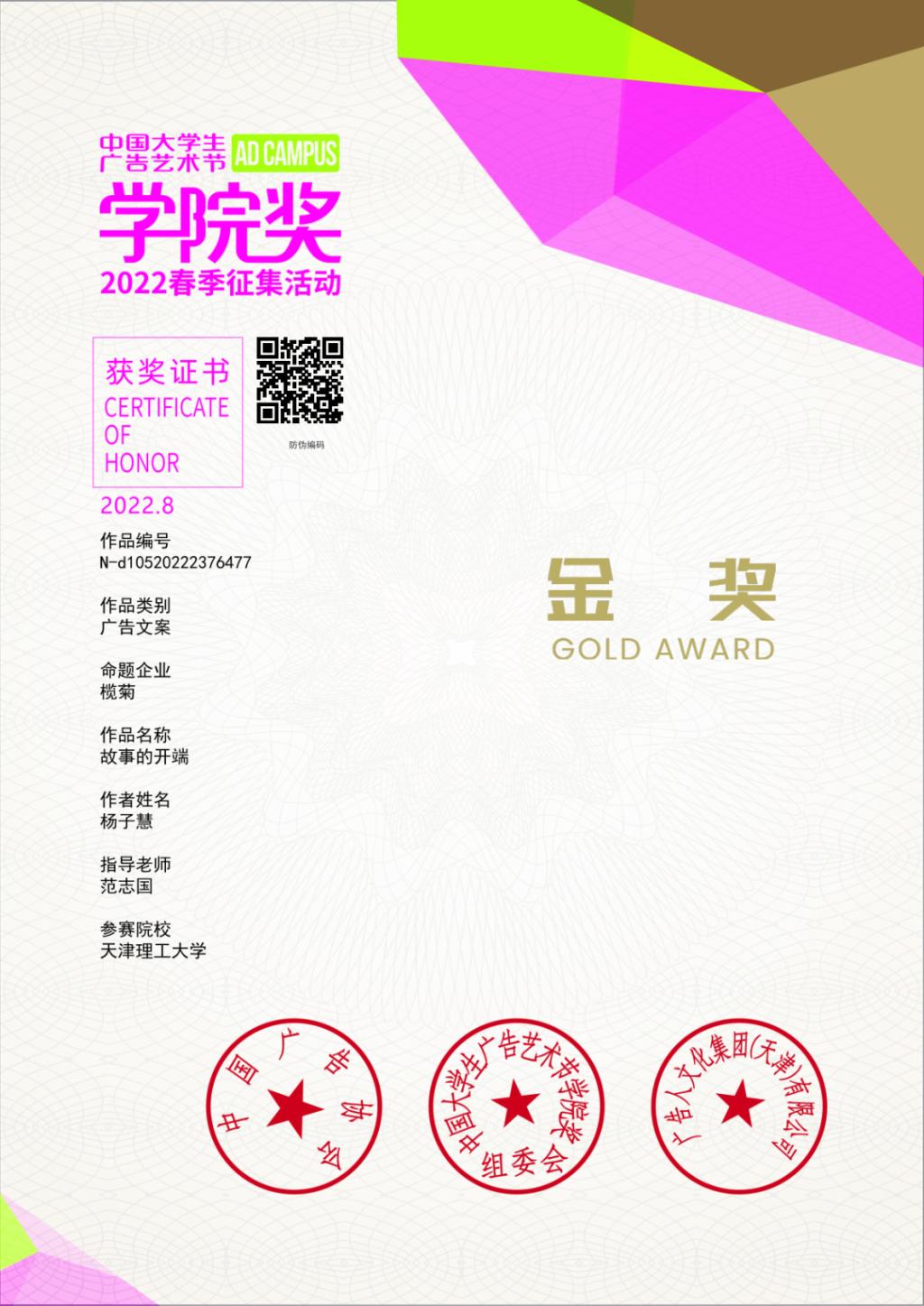 管理学院2021级市场营销专业杨子慧同学为榄菊日化集团创作的《故事的开端》获得榄菊广告文案赛道唯一金奖。