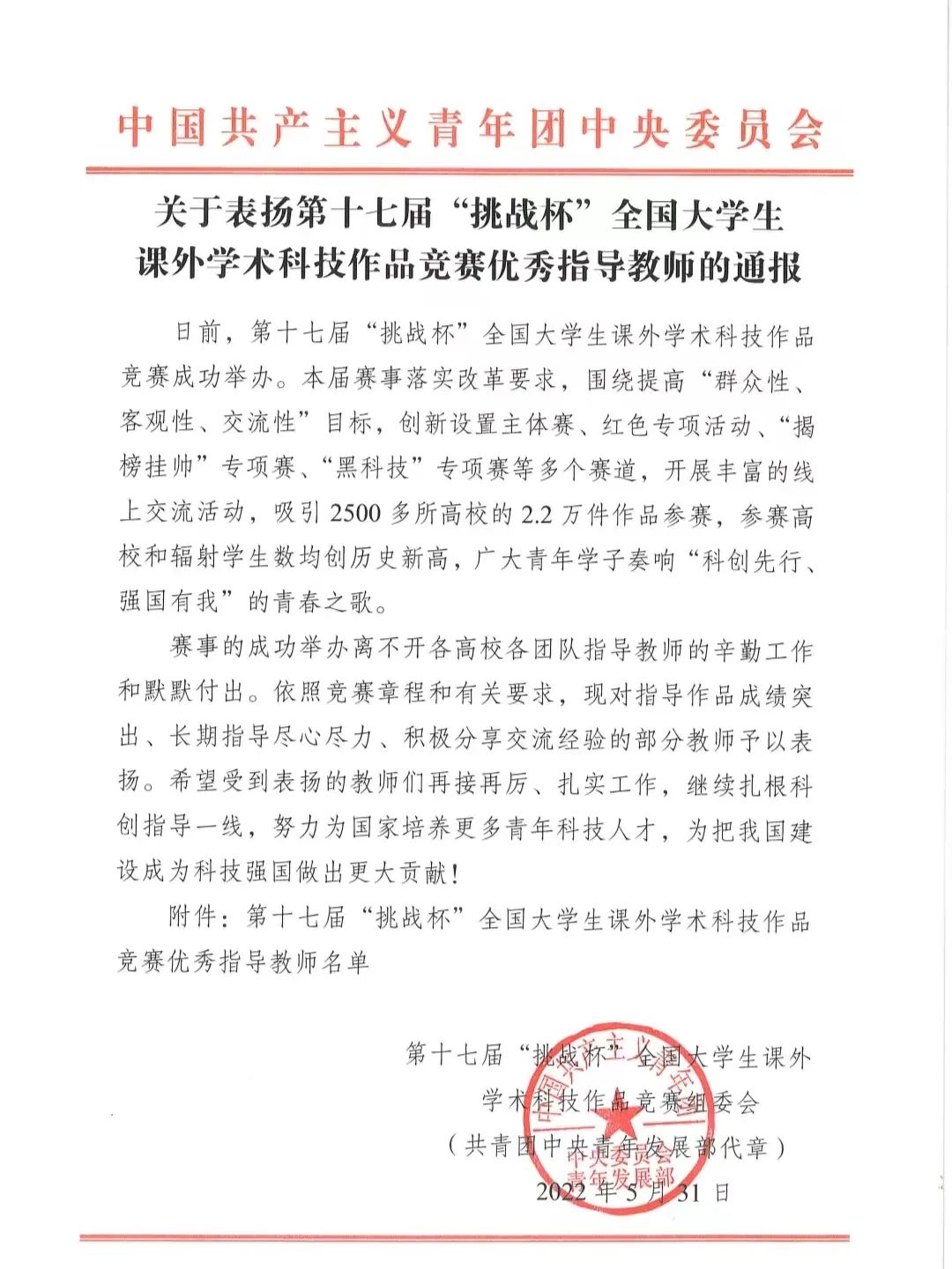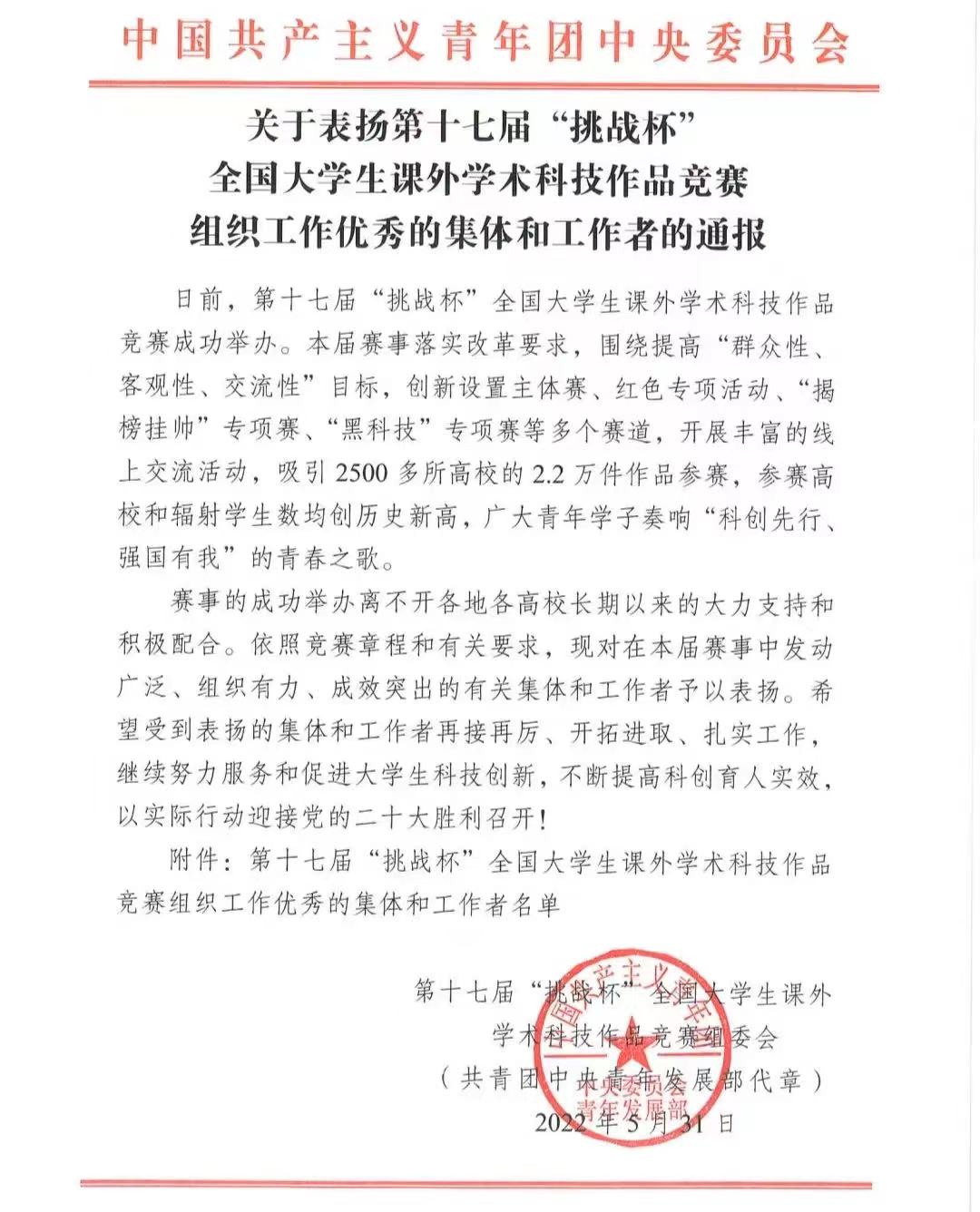 未来,学校将继续做好“挑战杯”系列赛事的竞赛组织、项目培育、氛围营造等工作,广泛搭建科技创新赛事平台,完善学生科创培养体系,引导广大青年投身科创热潮,以优异成绩迎接党的二十大胜利召开。