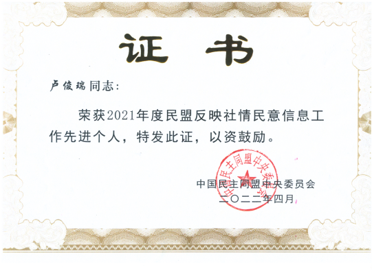 为表彰先进推广经验,着力提升民盟参政议政能力和水平,更好地履行参政党职能,努力做中国共产党的好参谋、好帮手、好同事,民盟中央对在2021年度参政议政工作中作出突出贡献的先进单位和先进个人予以表彰。新葡萄卢俊瑞同志荣获“民盟反映社情民意信息工作先进个人”称号。