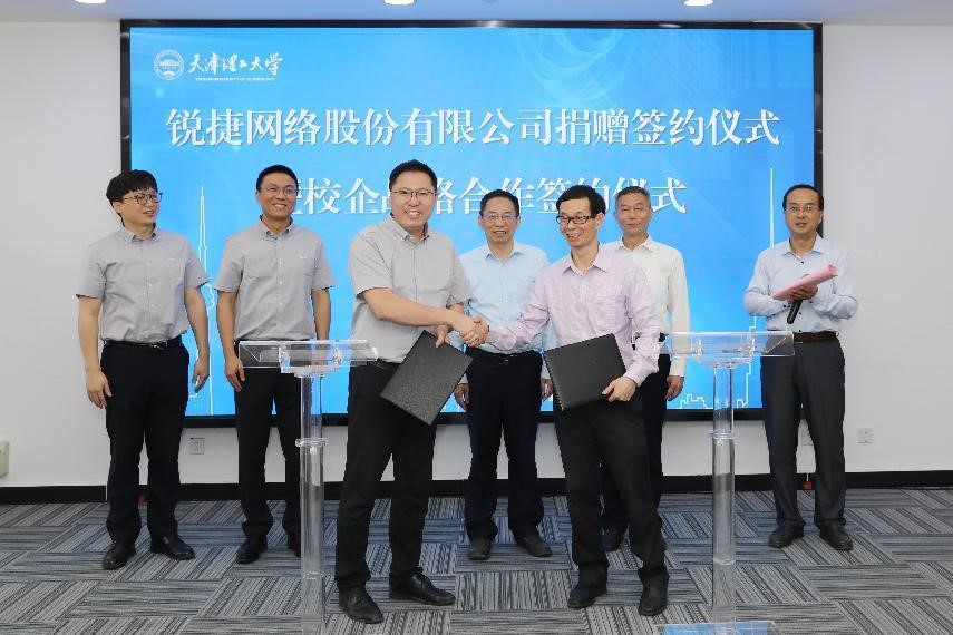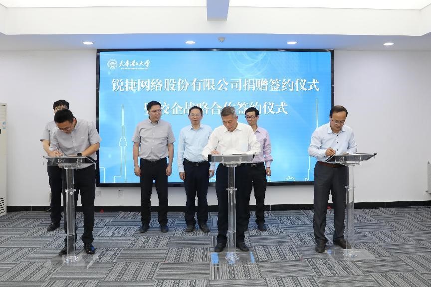 5月19日下午,锐捷网络股份有限公司向新葡萄AMG官方网站捐赠签约仪式暨校企战略合作签约仪式在新葡萄举办。锐捷网络股份有限公司副总裁兼北区总经理马雪峰,全国高教行业总经理黄镇,全国高教行业副总经理李栋,身份管理事业部副总经理关天,智慧教室事业部副总经理徐云彪,天津区域总经理贾斌,以及联合捐赠企业皖通科技天津研发中心、四川湖山电器股份有限公司天津分公司负责人出席仪式。校党委副书记、校长练继建,党委副书记杜长有,副校长陈胜勇,校友会、学校国有资产及校园经济管理处、校党委学工部、网络安全和信息化办公室、教务处、档案馆、计算机科学与工程学院、发展战略研究中心负责人出席仪式。
