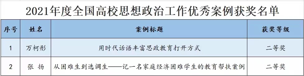 2021年度全国高校思想政治工作优秀案例征集活动共收到各省(区、市)、各有关高校推荐案例626篇。经资格审核、学术不端查询,《高校辅导员》编辑部组织专家对符合评审条件的565篇案例进行评审,共有381篇入选。其中,新葡萄环境科学与安全工程学院万柯彤撰写的《用时代话语丰富思政教育打开方式》、管理学院张扬撰写的《从困难生到选调生——记一名家庭经济困难学生的教育帮扶案例》均荣获2021年度全国高校思想政治工作优秀案例二等奖。