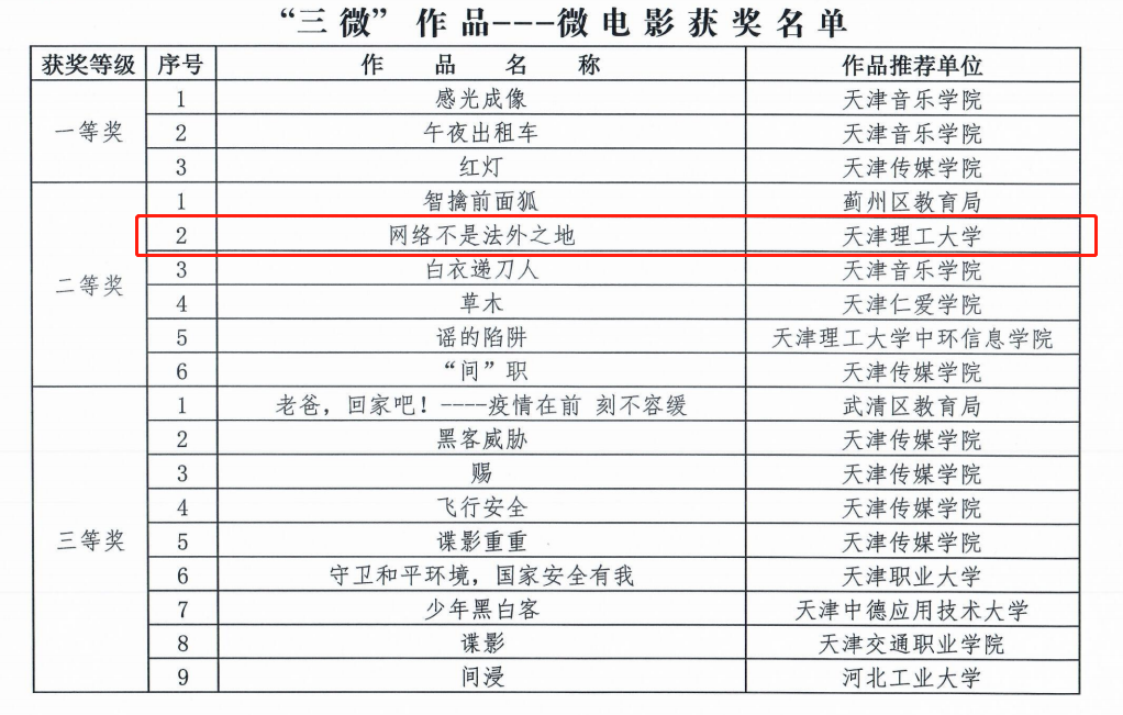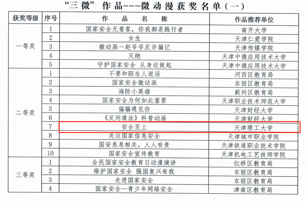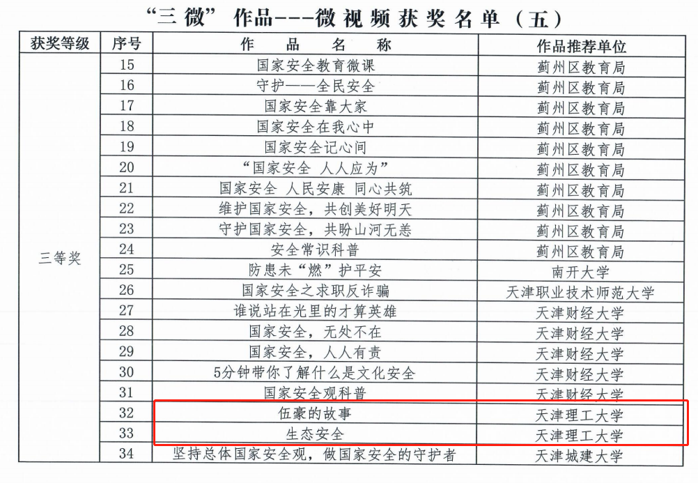日前,市教育两委下发《关于2022年教育系统国家安全宣传教育活动“三微”作品获奖的通知》(津教安函〔2022〕23号)。各参评单位紧密围绕“树牢总体国家安全观,感悟新时代国家安全观成就,为迎接党的二十大胜利召开营造良好氛围”主题,以着力推动大安全理念深入人心、落地生根,筑牢坚如磐石的首都政治“护城河”、 确保全市政治社会大局持续安全稳定,以优异的成绩迎接党的二十大胜利召开为主线,共报送“三微”作品300余部,参与人数达800余人。经过报送单位初评、专家复评,共评选出微电影优秀作品18部、微视频优秀作品138部、微动漫优秀作品30部、优秀组织单位13家。新葡萄师生创作的视频作品获得二等奖2个,获得三等奖2个。