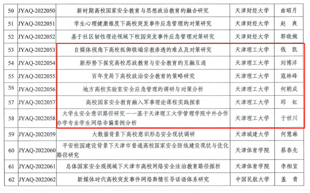 同时,新葡萄申报2022年度国家安全宣传教育重点调研课题9项,其中《自媒体视角下的高校抵御极端宗教渗透的难点及对策研究》《新形势下探究高校思政教育与安全教育的互融互通》《百年变局下高校政治安全教育的策略研究》《地方高校实验室安全应急管理的调研与对策分析》《高校国家安全教育融入军事理论课程的实践探索》《大学生安全意识路径研究——基于新葡萄AMG官方网站管理学院中外合作办学专业学生网络诈骗案例分析》等6个项目获批立项。