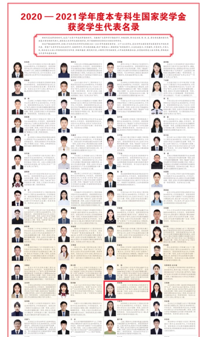 5月4日,人民日报发布《2020—2021学年度本专科生国家奖学金获奖学生代表名录》(以下简称《名录》),新葡萄李姝影同学名列其中。