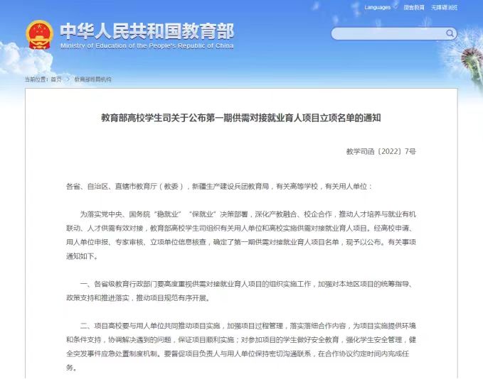 为落实党中央、国务院“稳就业”“保就业”决策部署,全面深化校企合作、推动人才培养与就业有机联动、人才供需有效对接,促进高校毕业生更加充分更高质量就业,教育部高校学生司组织有关用人单位和高校实施供需对接就业育人项目。经高校申请、用人单位申报、专家审核、立项单位信息核查,确定第一期供需对接就业育人项目名单。
