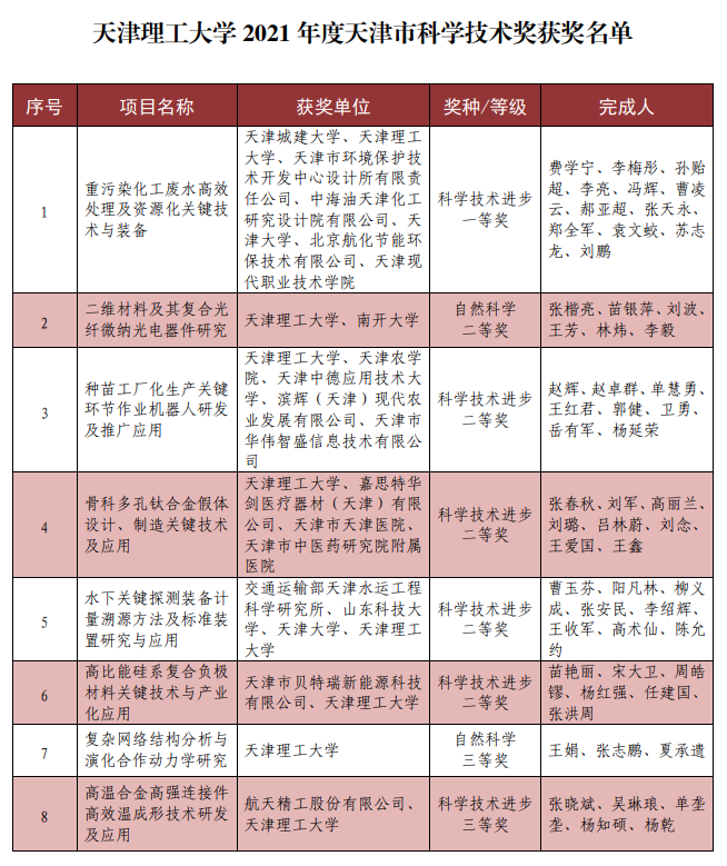 日前,天津市人民政府颁布《2021年度天津市科学技术奖的决定》(津政发〔2022〕3号),新葡萄8项科技成果获得天津市科学技术奖励,其中科技进步一等奖1项、自然科学二等奖1项、科技进步二等奖4项、自然科学三等奖1项、科技进步三等奖1项。