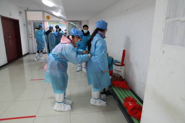 医务工作者、师生志愿者、后勤保障人员提前到达现场开展准备工作。