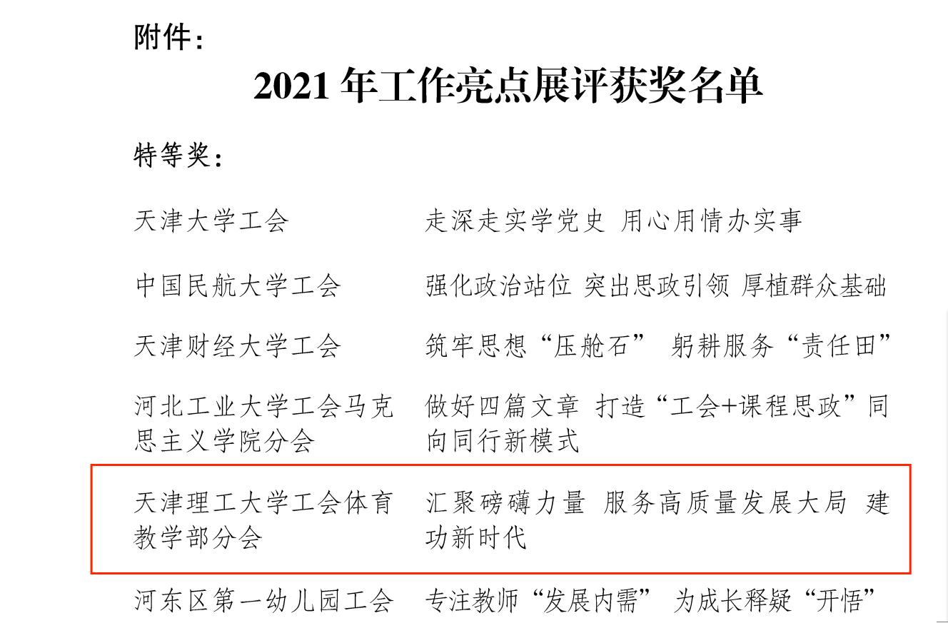 近日,为深入落实”我为群众办实事“实践活动要求,多视角反映教育系统各级工会实践收获,搭建成果分享交流平台,天津市教育工会举办2021年工作亮点展评活动,活动共有高校工会、高校附属医院、科研院所工会、区教育工会等21家单位参评。在全面梳理总结、自主推荐申报、现场展示交流的基础上,结合教职工评价认可度,经市教育工会八届二十次主席会议审议,确定新葡萄AMG官方网站工会体育教学部分会在本次评选中荣获市教育工会2021年工作亮点展评特等奖。