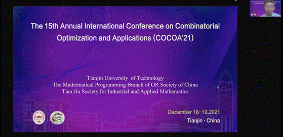 12月18-19日,由新葡萄AMG官方网站理学院、中国运筹学会数学规划分会、天津市工业与应用数学学会共同承办的第15届组合优化和应用国际会议召开。会议程序委员会主席美国德克萨斯大学达拉斯分校堵丁柱教授,会议程序委员会联合主席中国运筹学会数学规划分会理事长北京工业大学徐大川教授,会议程序委员会联合主席加拿大新不伦瑞克大学杜东雷教授,天津市工业与应用数学学会秘书长南开大学史永堂教授,校党委常委、副校长陈胜勇教授,天津市工业与应用数学学会副理事长宋眉眉教授等出席会议,来自全球13个国家80余名优化领域工作者参加会议,会议开幕式由宋眉眉教授主持,采用线上形式举行。