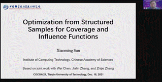 会议邀请中国科学院软件所孙晓明研究员和香港大学黄志毅博士分别做题为“Optimization from Structured Samples for Coverage and Influence Functions”和“Recent progress in online matching”的大会报告。在孙晓明研究员介绍结构采样优化,考虑其在最大覆盖问题以及最大似然估计,提供思考问题新视角。黄志毅博士介绍在线匹配问题的最新进展,提出在线广告问题的开放问题以及一般达到模型。