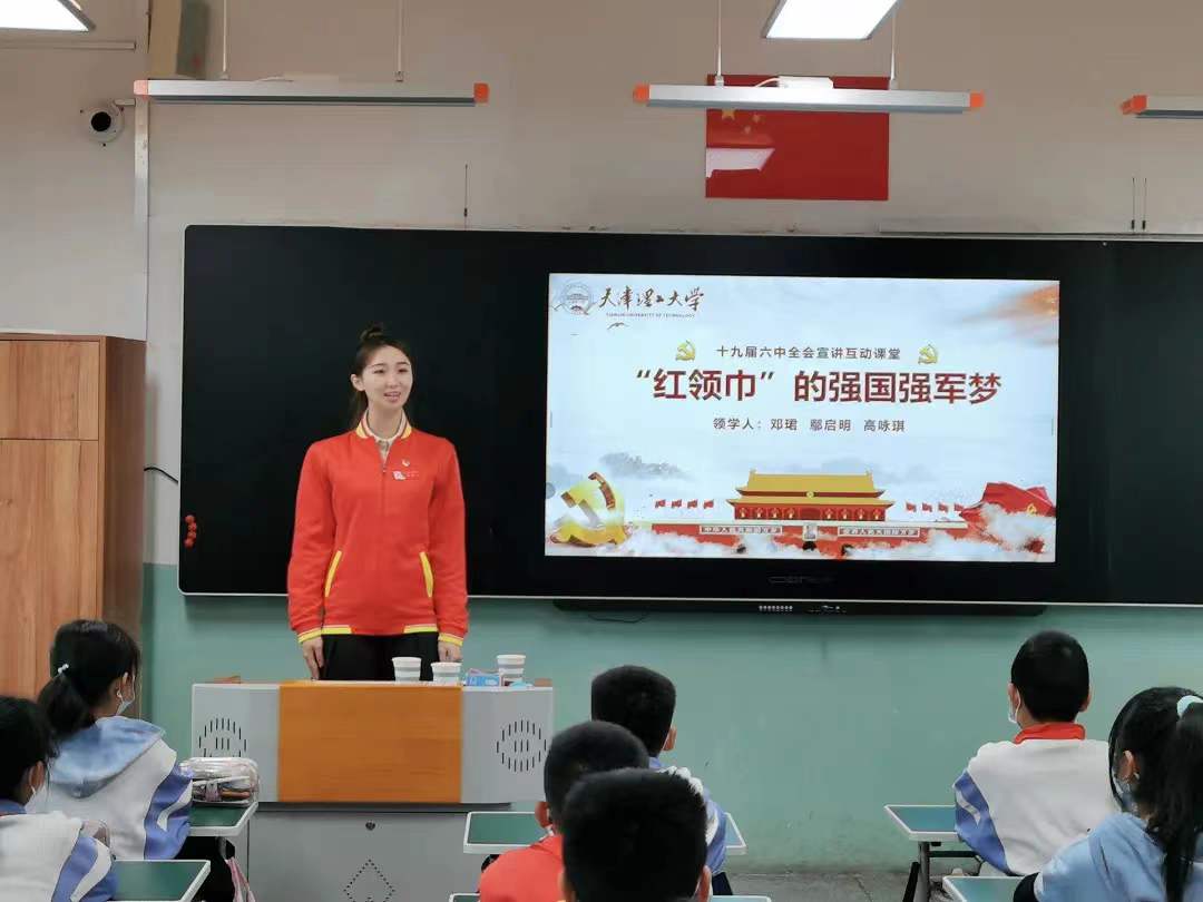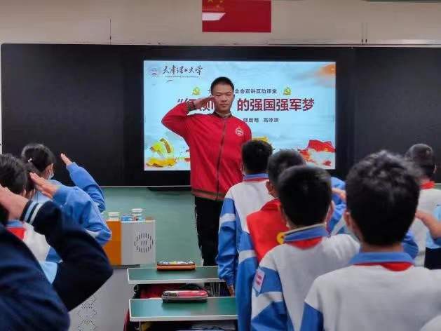 在王兰庄小学,市青马学员邓珺和学校第十八期青马学员、退役大学生先锋连队成员鄢启明、高咏琪以“‘红领巾’的强国强军梦”为题,开展教学互动实践。现场回响着少年嘹亮的军歌,矗立着青年挺拔的军姿,以强军梦的视角传递着党的十九届六中全会精神,在学生心中播撒下爱国强军的种子。青马学员勉励同学们要不断磨炼意志、自律自强、苦练本领,引导学生增强国防观念、坚定理想信念。