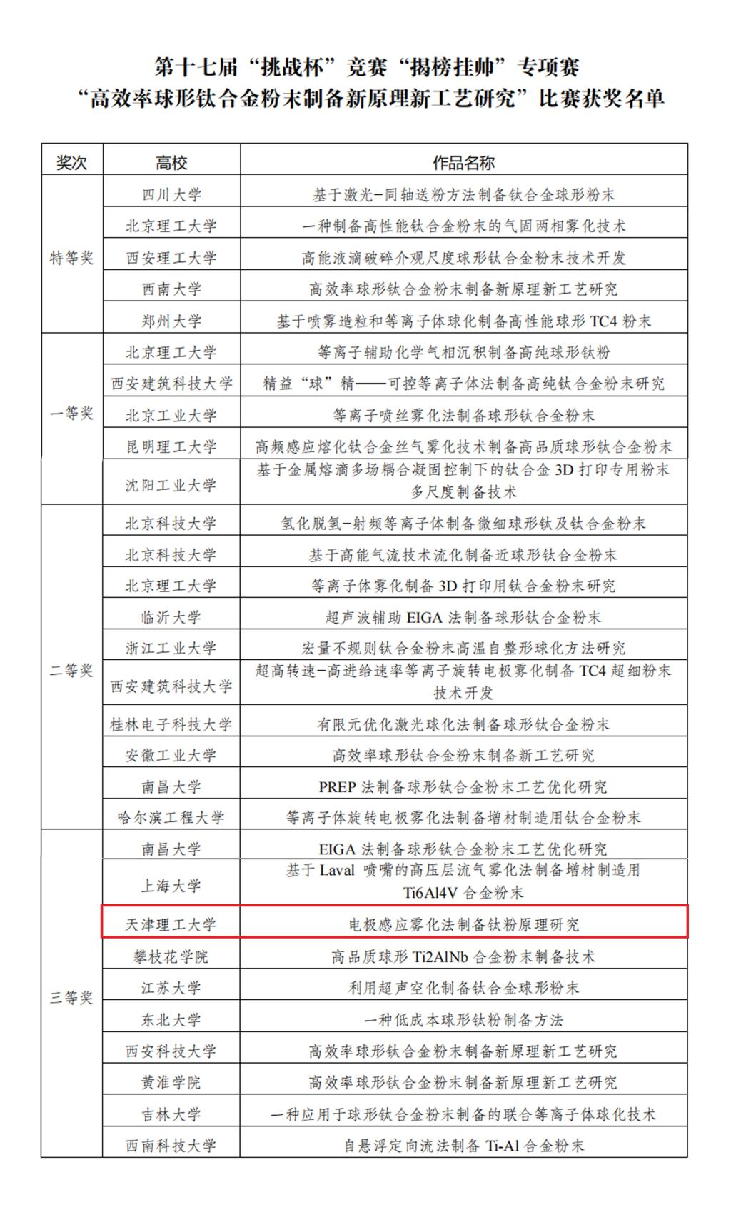 由攀钢集团研究院有限公司、共青团四川省委组织的第十七届“挑战杯”竞赛“揭榜挂帅”专项赛“高效率球形钛合金粉末制备新原理新工艺研究”比赛,经该选题评审委员会资格审查、初审、复审,由新葡萄材料科学与工程学院田银宝老师指导的参赛作品《电极感应雾化法制备钛粉原理研究》荣获全国三等奖。