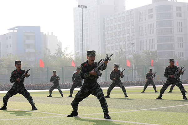 军事项目汇报表演中,由800人组成的倒计时方阵队形齐整、口号嘹亮,变换组成“1921”、“2021”、“新时代 新青年”、“听党话 跟党走”、校训“重德重能 求实求新”、倒计时等字样,震撼地开启了军事科目汇报表演。