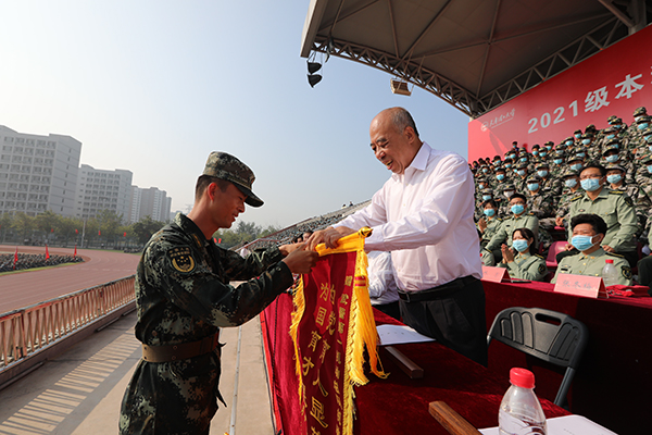 校长杨庆新向承训部队官兵赠送锦旗。