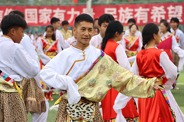 随后,红光中学西藏班学生用热情洋溢的舞蹈,展示了“民族学生心向党”。由天津体育职业学院100人组成的表演方阵带来的“青春在党旗下集结”,表达了有志青年响应祖国号召、听从党的指挥,奋勇前行勇挑重担的决心。全体参演学生向党旗敬礼,将全场气氛推向高潮,以饱满的热情和良好的风貌向中国共产党成立100周年献礼。最后,展演活动在全场师生《没有共产党就没有新中国》的歌声中落下帷幕。