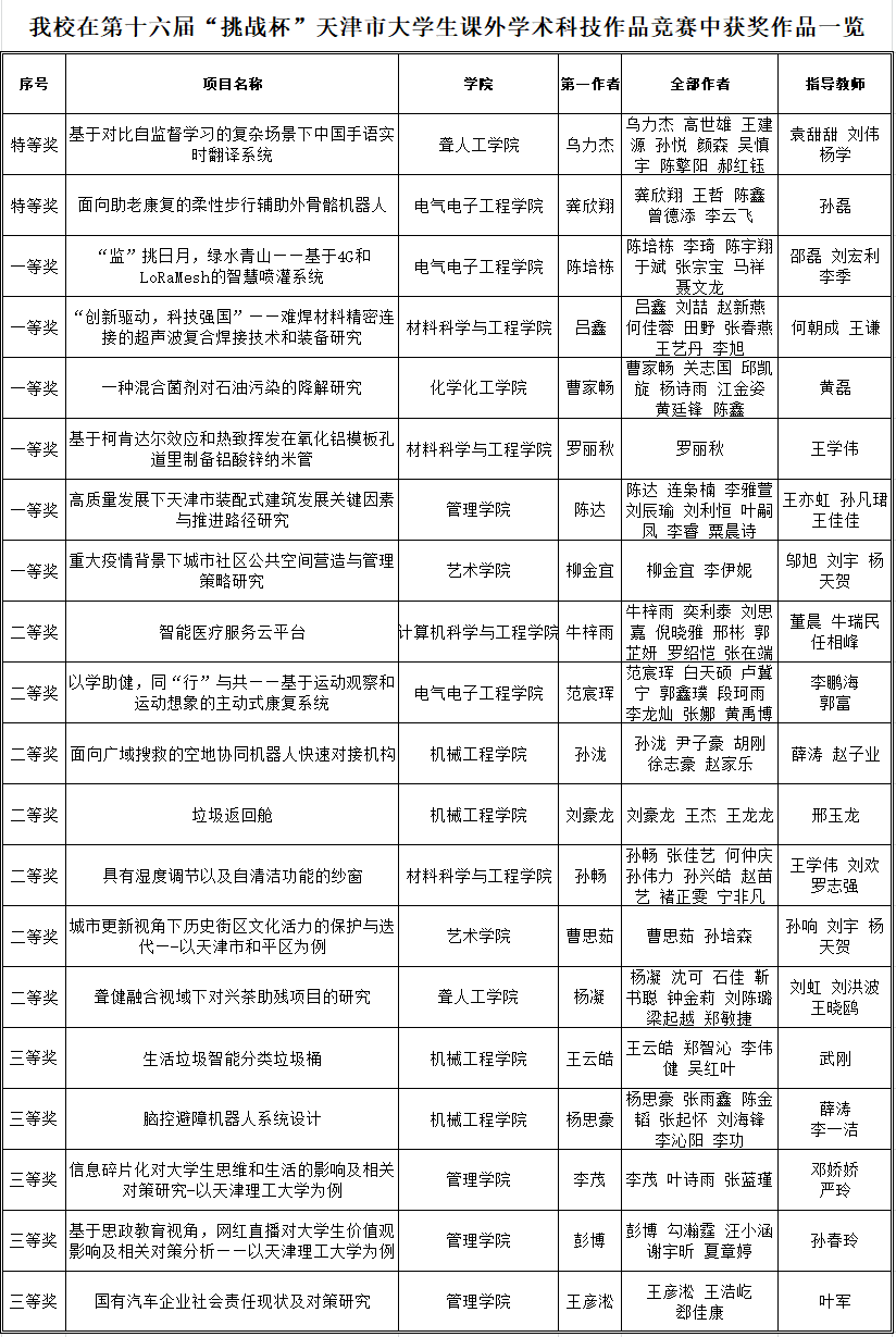 近日,由团市委、市委教育工委、市科技局、市教委、市科协、市社科院、市社科联、市学联联合举办的第十六届“挑战杯”天津市大学生课外学术科技作品竞赛最终成绩揭晓。新葡萄共报送自然科学类学术论文、哲学社会科学类社会调查报告和学术论文、科技发明制作类31项作品参赛,其中11项作品入围市级终审决赛。经专家评审,最终共获得20项等级奖,其中特等奖2项,一等奖6项,二等奖7项,三等奖5项,同时新葡萄荣获“市级优秀组织单位”荣誉称号。