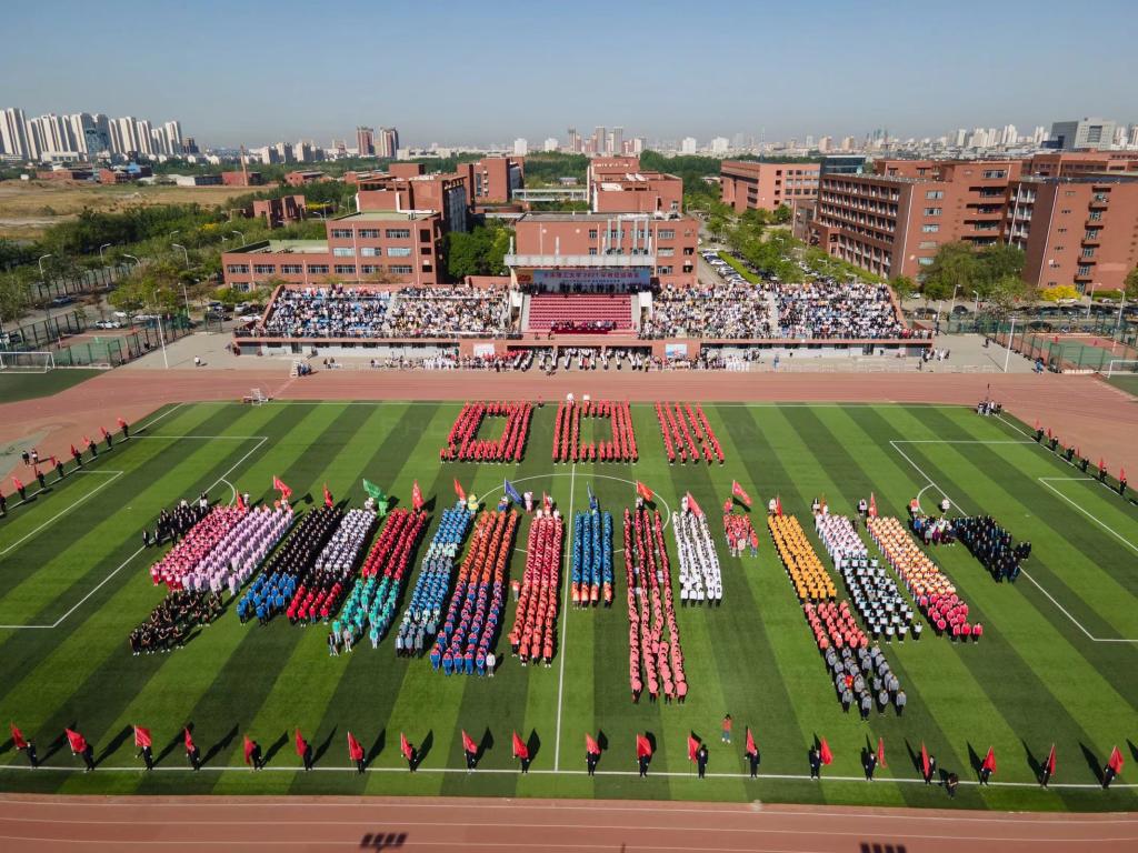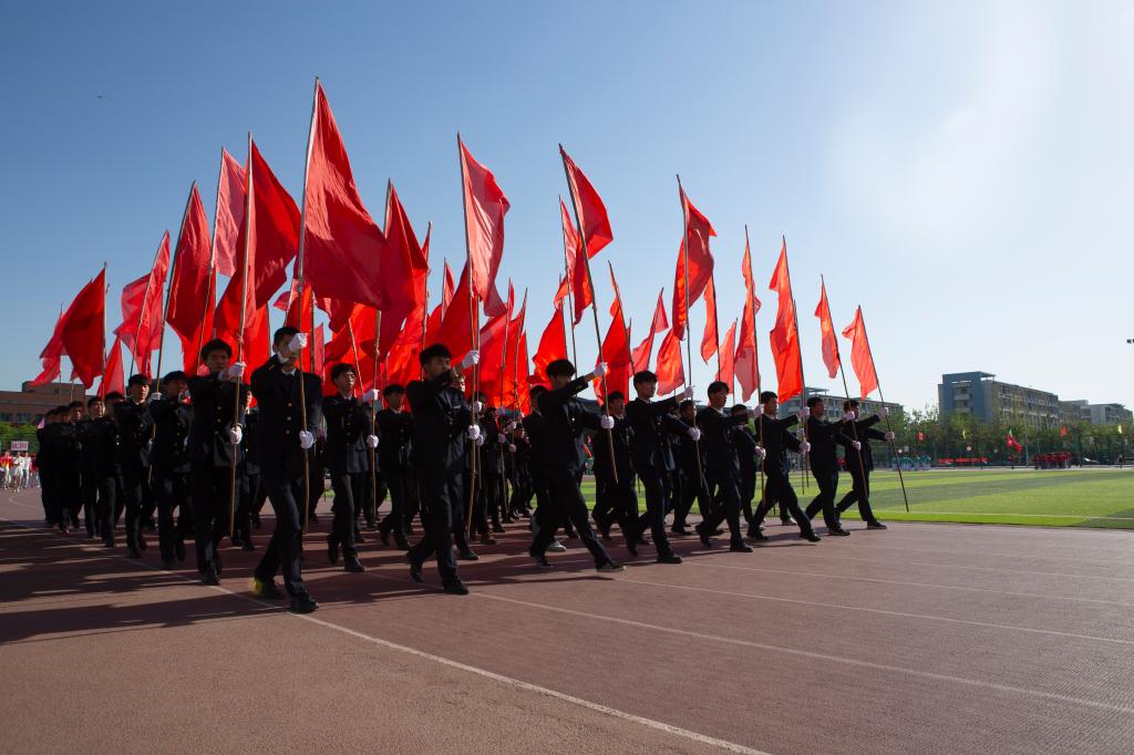 入场式后,来自机械工程学院、计算机科学与工程学院、管理学院、化学化工学院、环境科学与安全工程学院、聋人工学院的200余名学生伴随着《唱支山歌给党听》的旋律,手举国旗,从四面八方涌来,组成“100”方阵字样,向建党100周年献礼,表达莘莘学子对党的眷恋和感念之情。