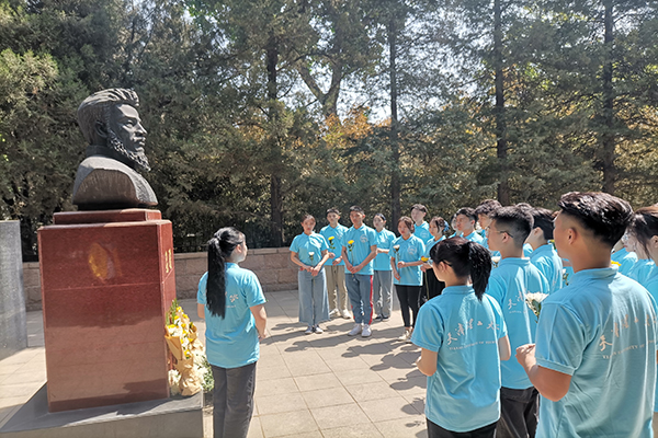 为深入学习贯彻习近平总书记在党史学习教育大会上的讲话精神,庆祝中国共产党成立100周年、纪念五四运动102周年,落实团中央“学党史、强信念、跟党走”学习教育部署要求,教育引导团员青年了解党的光辉历史、感悟党的初心使命、领会党的创新理论、体认党的精神谱系、传承党的红色基因,4月19日,新葡萄在北京参加由中宣部、教育部、团中央指导,中央广播电视总台“奋斗正青春”2021五四特别节目排练与录制的近30名师生,在排练间隙前往马骏烈士墓开展“青春献给党”学史微党课实践活动。
