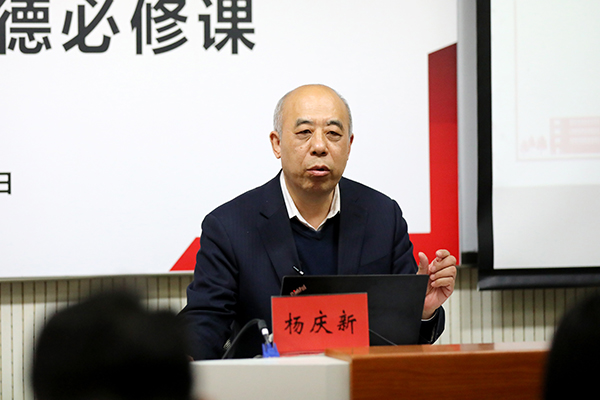 杨庆新强调,为全面贯彻落实好《关于加强和改进新时代师德师风建设的意见》,广大教师要用习近平新时代中国特色社会主义思想武装头脑,提高思想认识,突出政治引领。以学校“教风学风建设年”为契机和抓手,整体提升学校教书育人的氛围,进一步回答好“为谁教、教什么、怎么教”的问题,履行好立德树人根本职责,推进师德师风建设。发挥好教师主导作用,立足课堂主阵地,发挥课堂主渠道作用,在授课过程中,加强与学生沟通交流、思想碰撞,形成良好互动;立足第二课堂,通过指导学生参加科学实验、学科竞赛、社会实践、文体活动等,为学生增强创新精神和提高实践能力树立榜样,实现润物无声的育人效果。