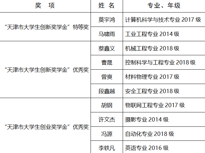 据了解,天津市大学生创新创业奖学金由各高校推荐申报、天津市教育发展基金会组织专家评审,旨在从天津市的高校中选拔一批积极投身各类创新创业实践的优秀大学生,进一步增强广大高校学生的创新精神、创业意识和创造能力,深化高等学校创新创业教育改革。此次评选中受到表彰的大学生,是天津市大学生中创新水平和创业能力的先进代表,展现了青年学生良好的创新创业和研究实践能力。