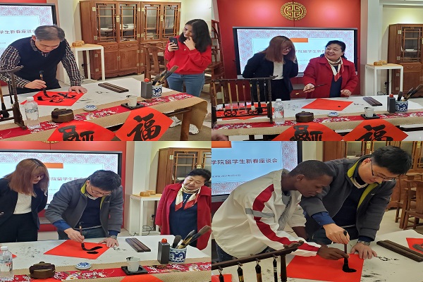 座谈会围绕“腊月二十九,贴春联”主题展开。中国文化展示室,各式书体的福字、对联、吊钱、中国结等精美装饰映入眼帘,使得留学生们不禁赞叹“真漂亮,‘年味’太浓了!”。学院老师分别从节日习俗和书法艺术的角度为留学生们详细介绍了对联、吊钱、福字等春节传统文化元素内涵,并指导他们拿起毛笔纷纷写下了“福”、“我爱新葡萄”等字,寄托新年的美好愿望。