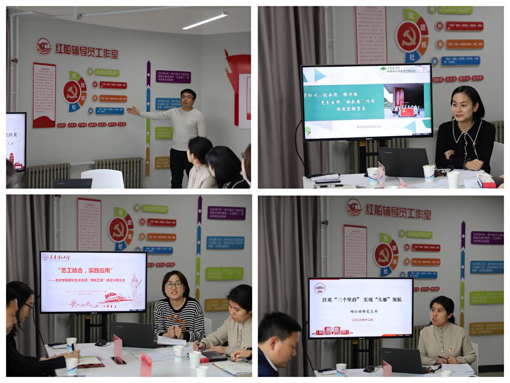 活动中“红船”辅导员工作室负责人介绍了工作室的简介、定位、工作理念以及建设思路。学校首批“领航工程”研究生党支部围绕“守初心 创品牌 强功能,充分发挥‘领头雁’作用构筑坚强堡垒”、“艺工结合,实践应用”,“注重三个坚持,实现头雁领航”进行了支部管理经验分享。