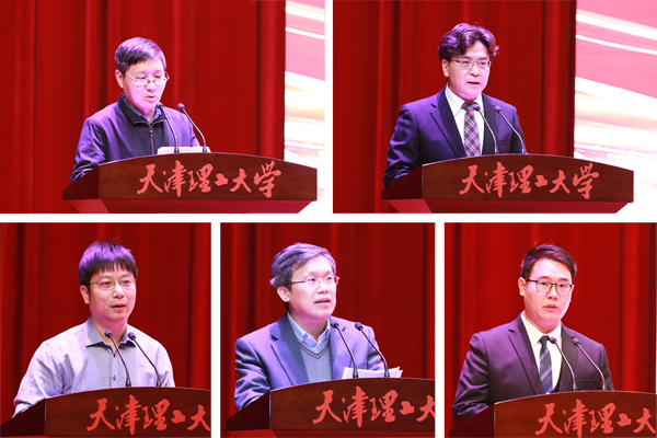 马克思主义学院院长马用浩、管理学院院长王京滨、新能源材料与低碳技术研究院院长丁轶、研究生院院长王劲松、电气电子工程学院研究生曹晟分别代表研究生培养单位、研究生教育管理职能部门和在校研究生上台交流发言。