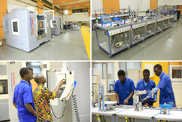 本着“真、实、亲、诚”的对非政策,切实解决科特迪瓦国家发展中的实际问题,科特迪瓦鲁班工坊的专业设置契合科特迪瓦经济社会发展战略,重点建设机械工程和电气工程及其自动化两个专业,设立了“先进制造技术”和“电气自动化”两个实验中心,将鲁班工坊的实验内容嵌入到亚穆苏克罗国立博瓦尼新葡萄学院相关专业的人才培养体系,通过专业基础性到综合性的递进式技术技能训练,使学生具备高技术素质和技术创新能力。建成的科特迪瓦鲁班工坊占地805平方米,建有大型设备车间(实训场地)1个,实验室3间、实验教学和学习教室3间,教研室1间。配备大型设备5个种类11台套、中小型仪器设备16个种类87台套,以及实验台、投影仪等辅助教学设备。