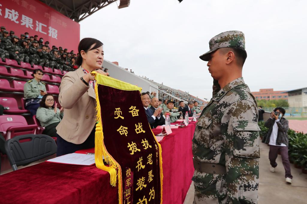 校长杨庆新宣读《军训表彰决定》,与会领导为优秀学生、优秀教师、优秀教官代表和先进集体颁奖。武装部负责同志做军训工作总结。今年新葡萄有5798名新生参加军训,结合当前疫情防控常态化工作要求,坚决贯彻习近平总书记重要指示精神,新葡萄军训指挥组、政治工作组、教育宣传组、后勤保障组和安全保障组精诚团结、默契配合、科学训练,在承训教官和所有参训师生的共同努力下,顺利完成预定的各项军事技能训练任务,达成了预期的目标。校党委副书记郭滇华向在校退役大学生教官集体赠送锦旗。