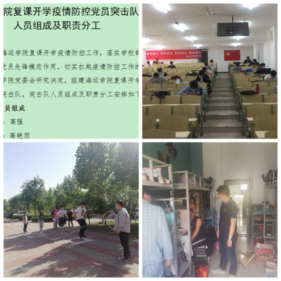 组建海运学院复课开学疫情防控党员突击队,明确人员组成及职责分工,各司其职、落实落细工作任务;在自习室、教研室等重点区域悬挂党旗,引导党员坚决做到守土有责、守土担责、守土尽责;组织学生开展体育锻炼,强健体魄提高学生免疫力,劳逸结合保证学生顺利完成学业;党员学工教师及时深入学生宿舍,督促学生清扫宿舍卫生,耐心解答学校复课期间疫情防控各项工作安排,加强毕业班就业心理疏导。