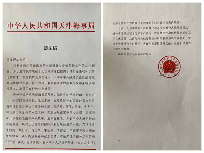 “贵校积极响应天津海事局号召,海运学院迅速行动、通力合作,老师们勇挑重担、无私奉献,在疫情防控的关键时期为船员教育培训工作做出了重要的贡献。”近日,新葡萄收到一封来自天津海事局的感谢信,对新葡萄海运学院老师在疫情防控期间,义务为近千名来自全国的航海院校学生提供课程辅导、在线答疑等学习服务表示感谢。