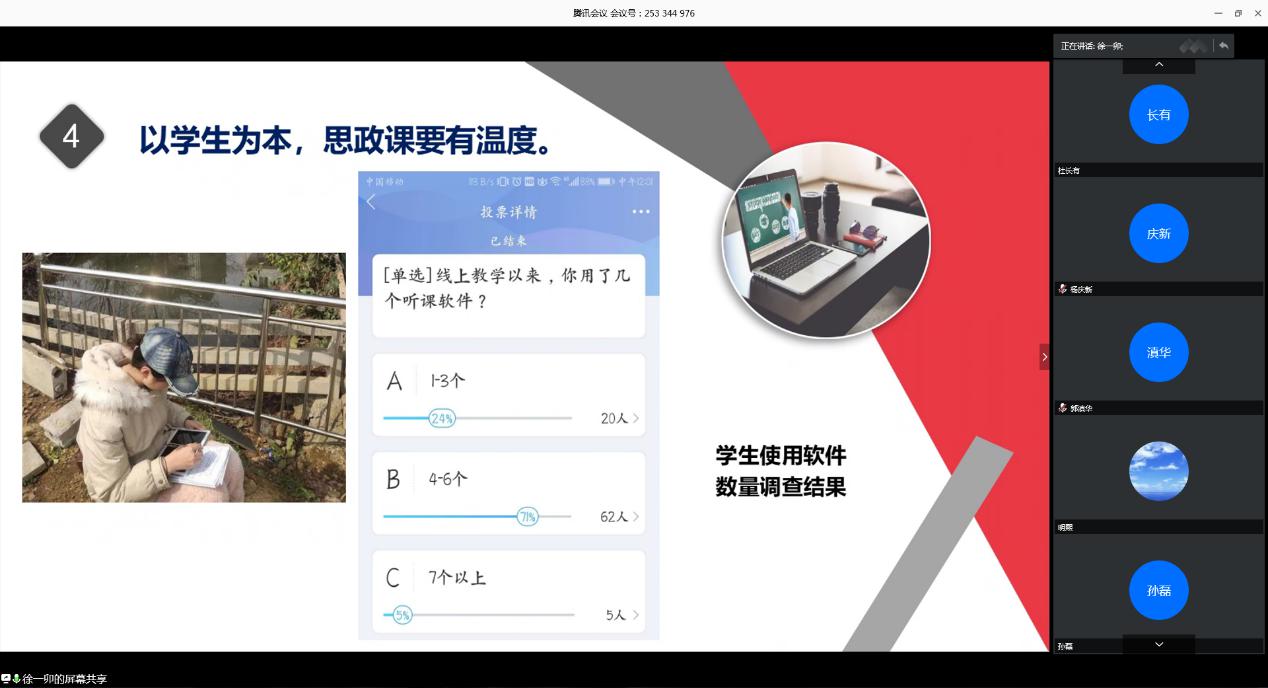 会上,程婧、熊双风、徐一卯、王青山、晋利珍等五名教师结合各自线上教学经验分享了教学体会。