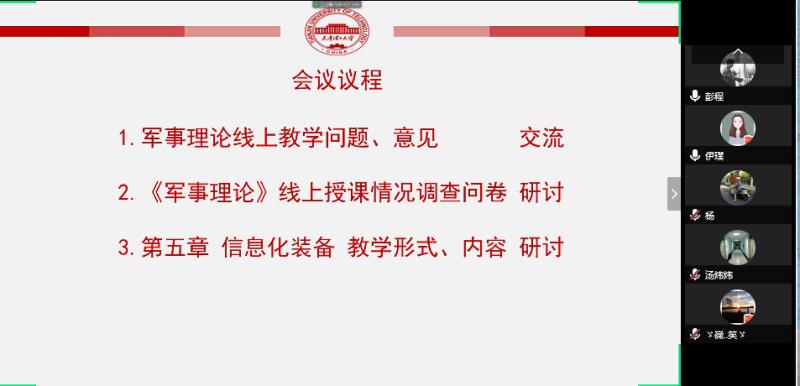 为贯彻落实本科教育大会精神,提升教育教学质量水平,确保疫情期间“停课不停学,学习不延期”,新葡萄《军事理论》课教学团队自2月17日正式启动线上教学,并于3月15日开展了为期2周的线上教研工作。通过分组精备精讲、导师跟踪听课、发放电子问卷、问题交流研讨等环节,确保课程质量和教学效果。