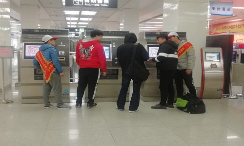 第三组志愿者服务队在红旗南路地铁站开展了“平安出行”志愿服务活动。为了行人出行的方便和安全,环志愿者们在上下班人流高峰时段进行服务。指引乘客并维持乘客的通行秩序,保证人流高峰期地铁站的通畅。