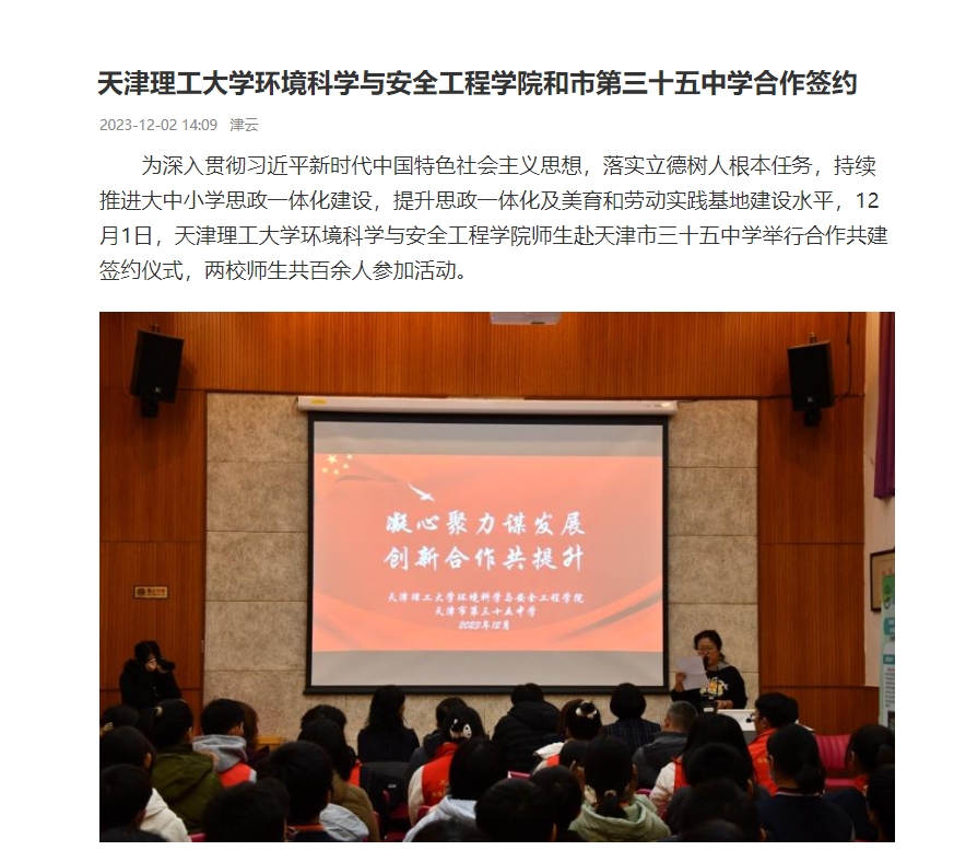 凝心聚力谋发展,创新合作共提升。环境科学与安全工程学院将不断加强与天津市第三十五中学的交流合作,共同探索新时代思政育人的有效途径,并以此为契机,在创新教育、课程共建、实践共建、劳动育人等方面提升共建质量,形成强大思政育人合力,助推天津教育事业的高质量发展。(天津日报记者姜凝)