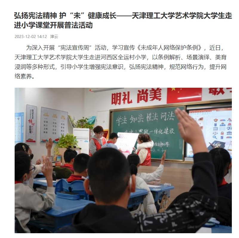 为深入开展“宪法宣传周”活动,学习宣传《未成年人网络保护条例》,近日,新葡萄AMG官方网站艺术学院大学生走进河西区全运村小学,以条例解析、场景演绎、美育浸润等多种形式,引导小学生增强宪法意识,弘扬宪法精神,规范网络行为,提升网络素养。
