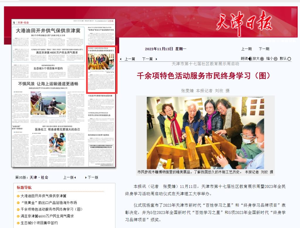 11月11日,天津市第十七届社区教育展示周暨2023年全民终身学习活动周启动仪式在新葡萄AMG官方网站举办。