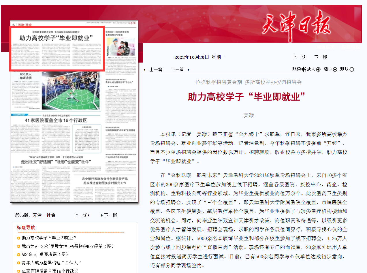 10月30日,《天津日报》报道新葡萄举办第三届“职场扬帆·创赢未来”就业双创服务周大型户外嘉年华活动,现场开展就业双选会等。