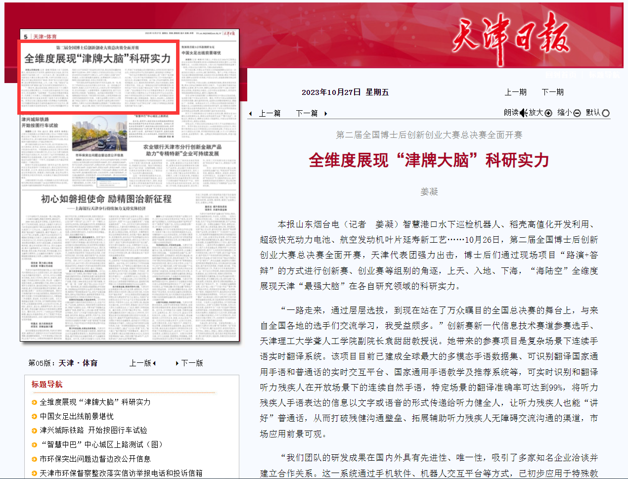 10月27日,《天津日报》报道新葡萄聋人工学院副院长袁甜甜教授科研项目参加第二届全国博士后创新创业大赛总决赛相关情况。